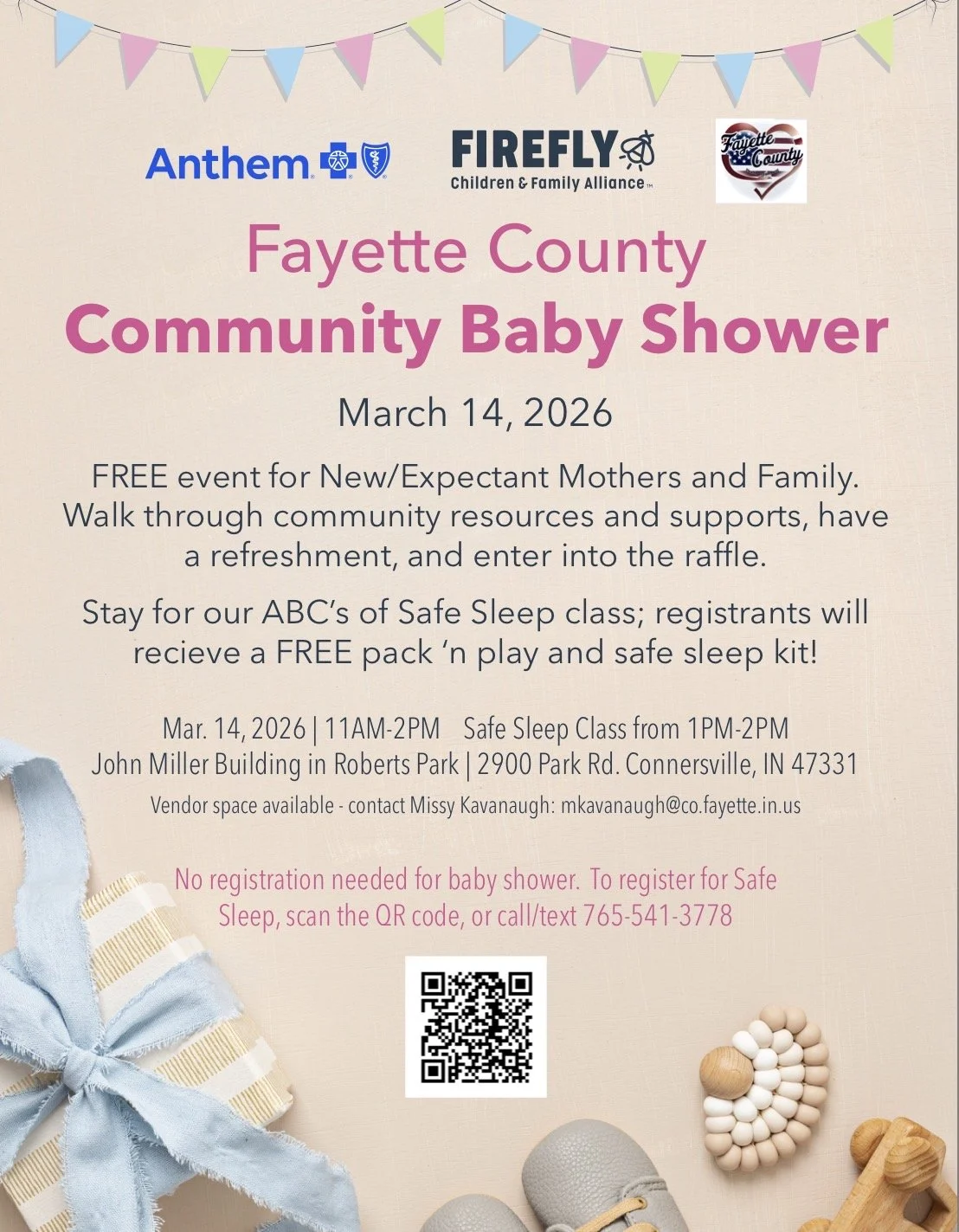Fayette County Community Baby Shower Saturday, March 14, 2026 11:00 AM 2:00 PM John Miller Building in Roberts Park 2900 Park Road Connersville, IN, 47331 United States (map) Google Calendar ICS